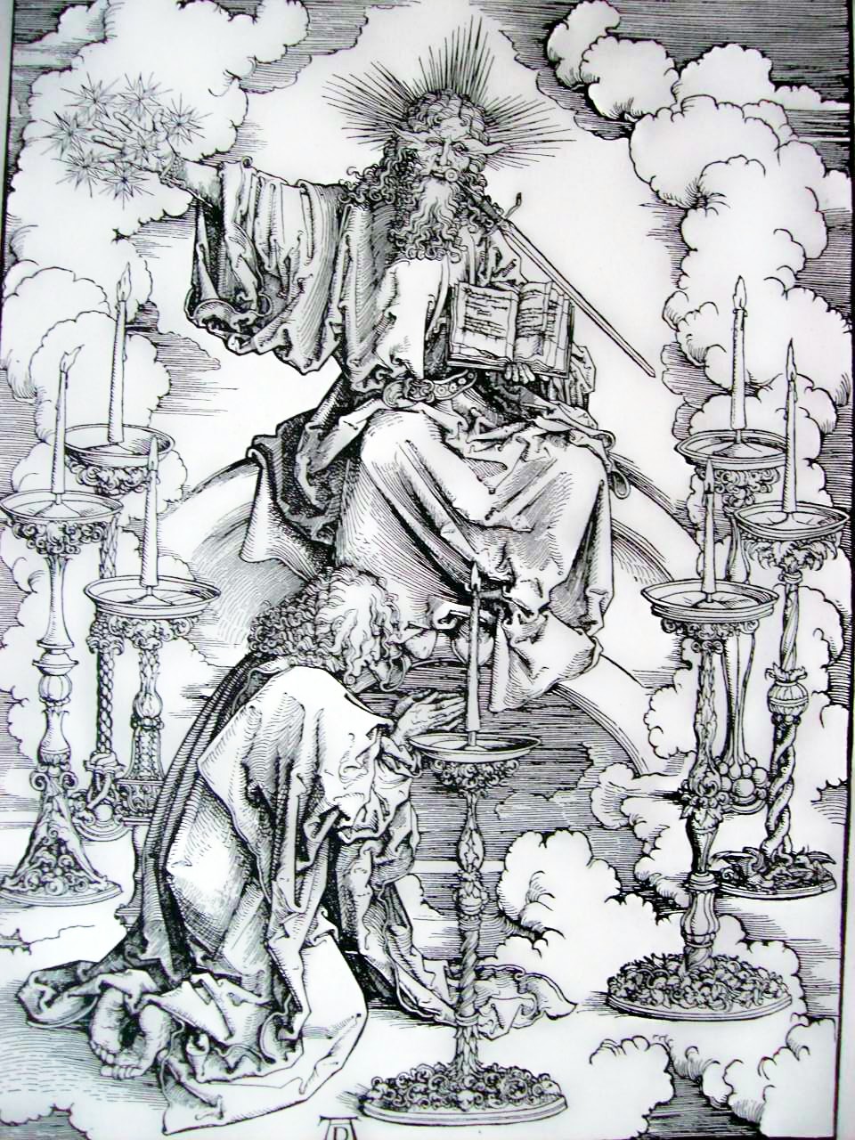 En la primera lámina, San Juan ve al Padre eterno entre los siete candeleros de oro.