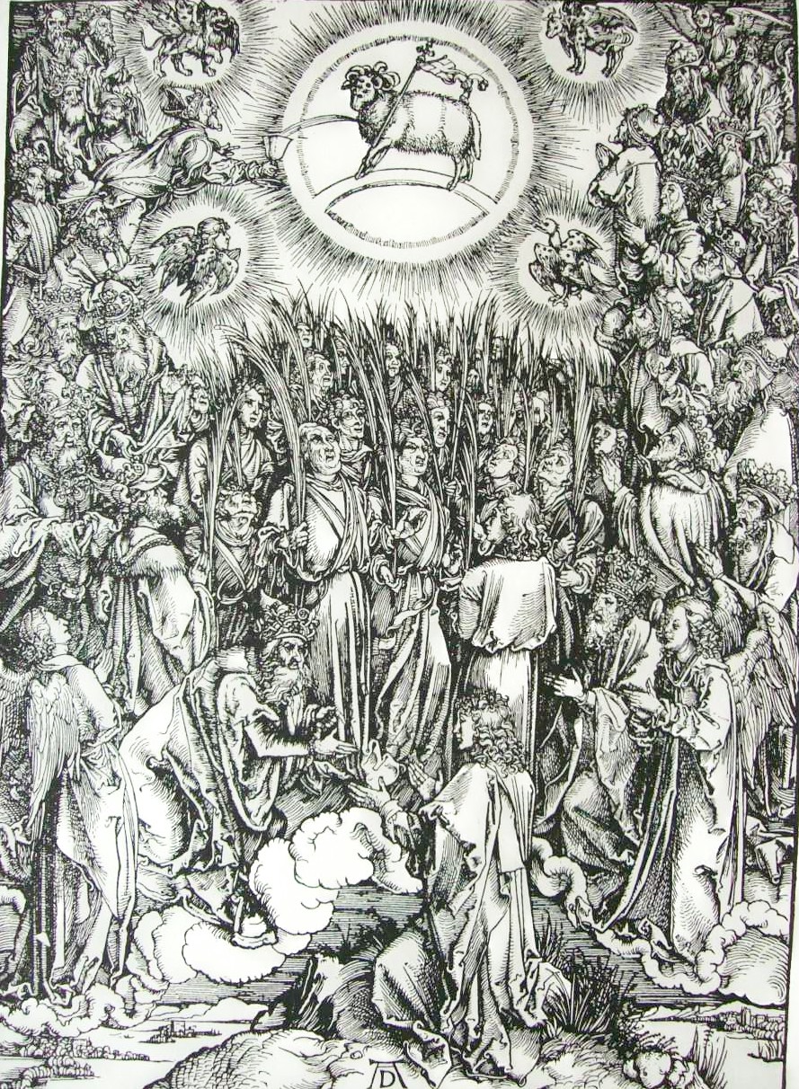 La Adoración de los Elegidos en el Cielo."Después miré y había una muchedumbre inmensa, que nadie podría contar, de toda nación, razas, pueblos y lenguas, de pie delante de trono y del Cordero, vestidos con vestiduras blancas y con palmas en las manos... Y todos los Angeles que estaban en pie alrededor del trono, de los Ancianos y de los cuatro Seres, se postraron delante del tron, rostro en tierra, y adoraron a Dios".